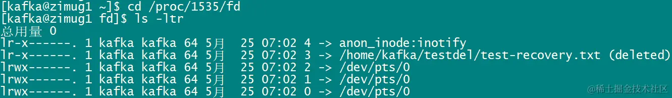 tail 1535 kafka 3r REG 253,2 26 34095906 /home/kafka/testdel/test-recovery.txt (deleted)