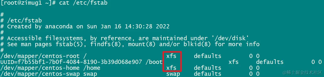 对于场景二,没有程序使用该文件,则该文件被删除之后进行文件恢复就稍微麻烦一些了。首先我们要区分当前操作系统挂载的磁盘目录的文件格式,比如:执行cat /etc/fstab得到如下的结果