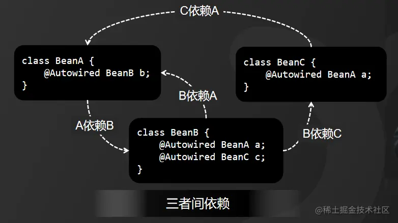 2、三者间依赖,也就是A 依赖 B,B 依赖 C,C 又依赖 A,形成了循环依赖。