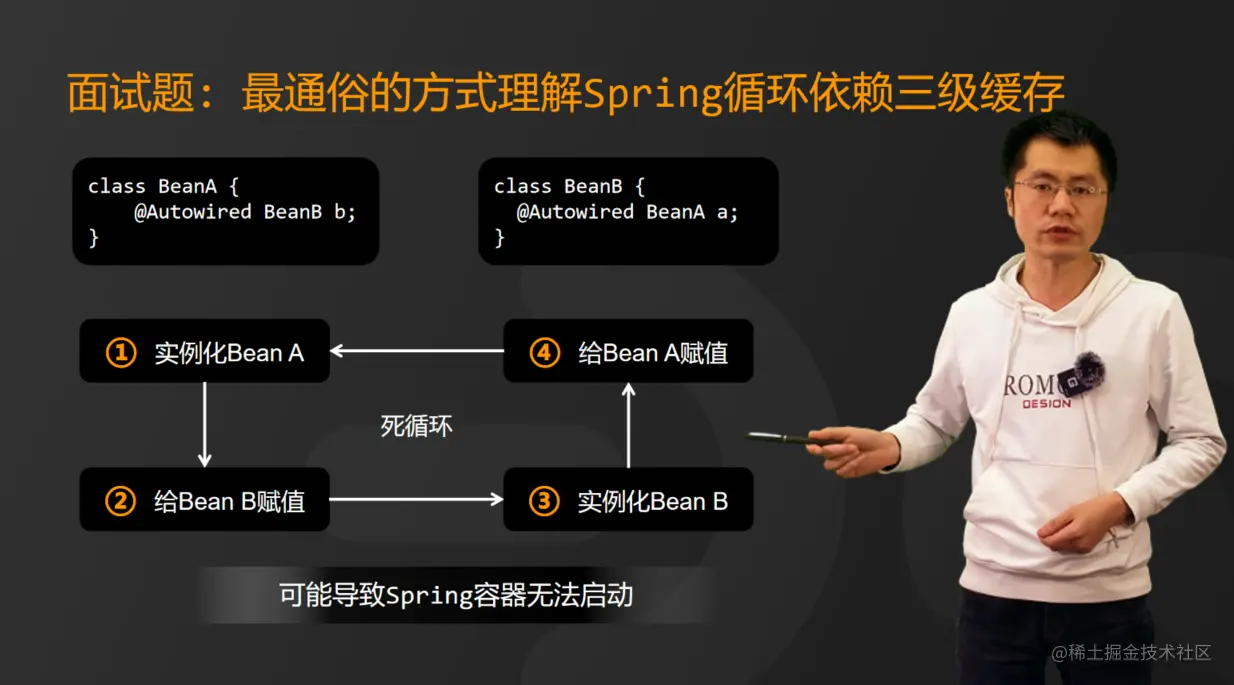 循环依赖本身没有问题,问题是Spring中加入了依赖注入机制,也就是自动给属性赋值。当创建Bean实例化以后,需要给Bean中需要赋值的属性全部自动赋值才能交给用户使用。但如果是循环依赖的情况,以两个Bean相互依赖的情况为例,