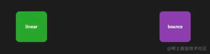 在下面的演示中看看 no ease 和bounce ease 之间的区别!绿色盒子以匀速的速度旋转,而紫色盒子带有“反弹”旋转动画,感觉就不一样。