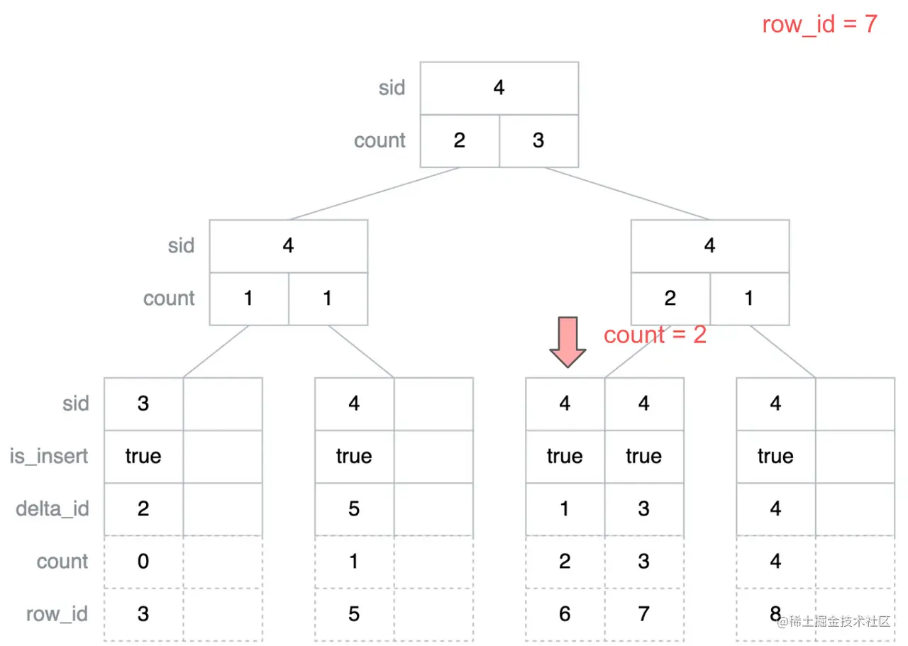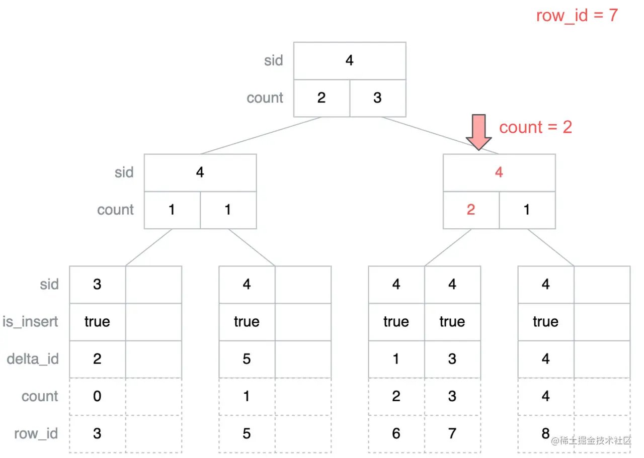 下面以查找 row_id = 7 所在的最右侧叶子节点为例演示一下上面的算法,首先从根节点开始遍历,此时 count 的初始值为 0,根节点的 sid 加上其左子树的 count 值小于要查找的 row_id,即右子树最小的 row_id 小于要查找的 row_id,因此接下来需要继续遍历右子树。