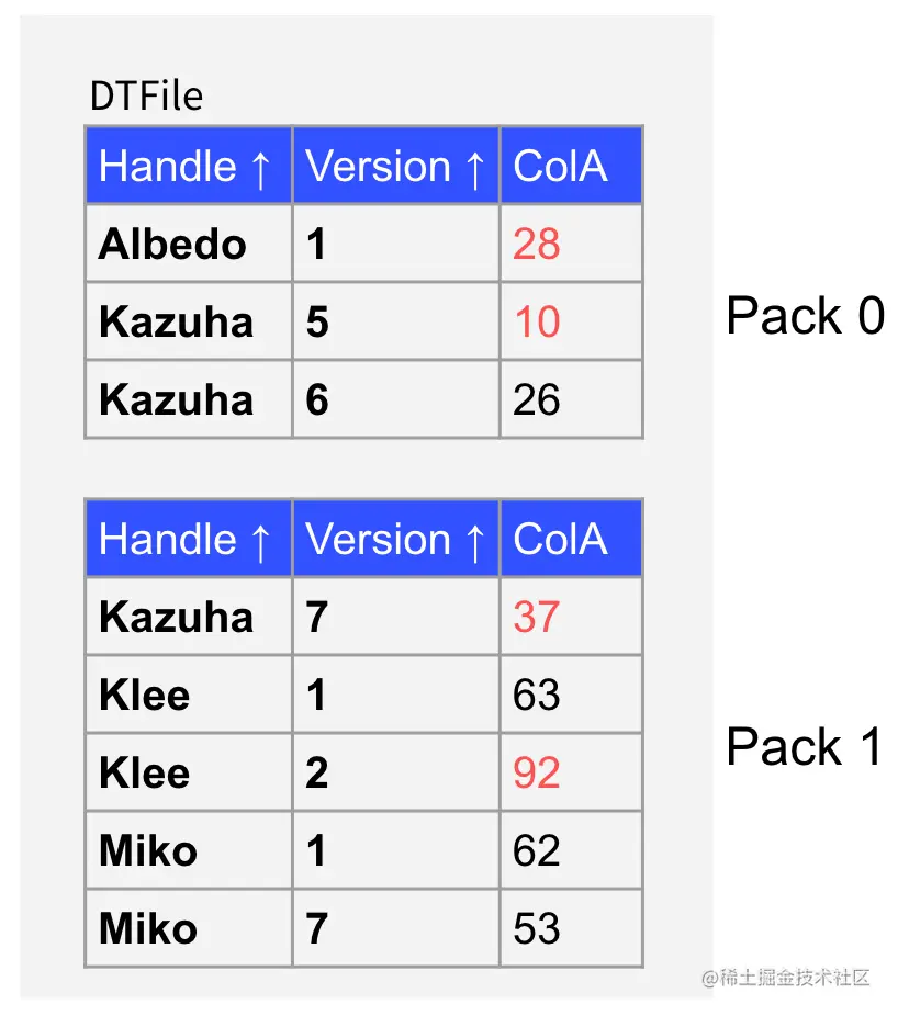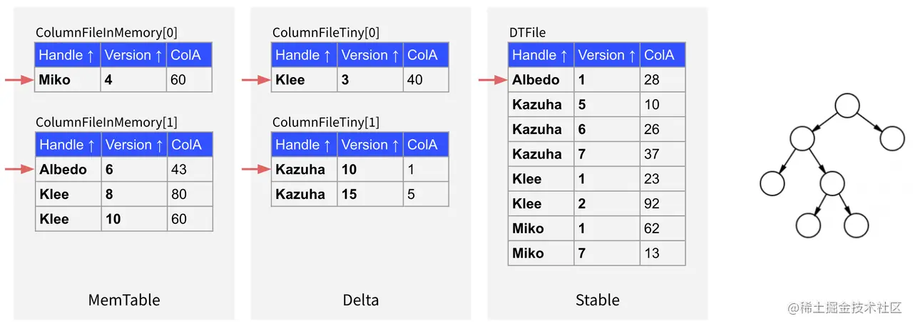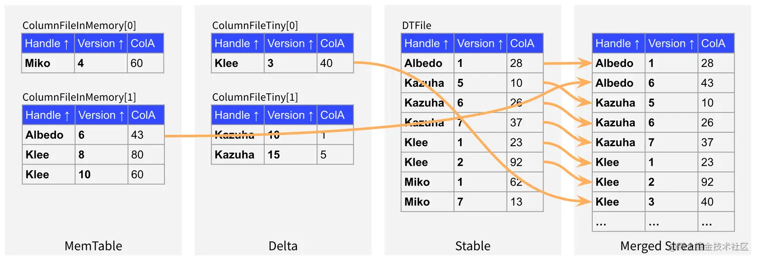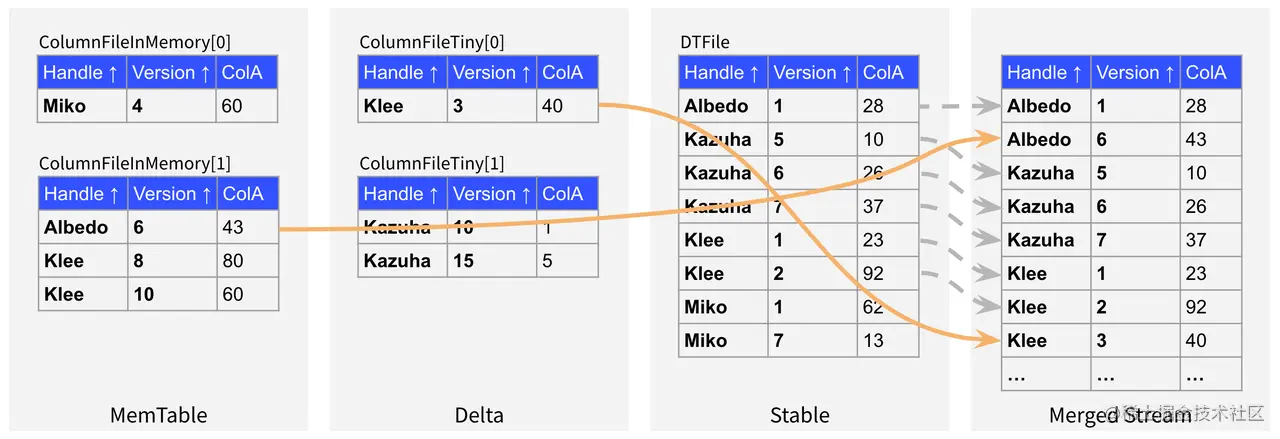 Stable 层的数据是按照 DTFile 的形式存储的,并且数据是按照 Handle 列和 Version 列全局有序的。Delta 层的数据分为磁盘和内存两部分,并且都是按照 ColumnFile 的形式组织的,但是 ColumnFile 内部不保证完全有序。