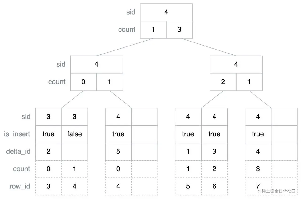 DeltaTree Index 是一个类似 B+ 树的结构,为了演示方便,这里假设每个内部节点只有两个子节点,每个叶子节点可以容纳两个 Entry,如下图所示,其中 sid 在叶子节点中代表在处理当前 Entry 之前需要处理的 Stable 的数据行数,在内部节点中代表右子树中最小的 sid;is_insert 只在叶子节点中存在,代表这个 Entry 对应的是插入操作还是删除操作,其中删除操作代表的是删除 Stable 层某个位置的数据;delta_id 也只在叶子节点中存在,代表的是这个 Entry 对应数据在 Delta 层的偏移;count 在内部节点中代表对应子树中插入的数据行数减去删除的数据行数的值,而在叶子节点中 count 并没有实际存储下来,而是在遍历过程中计算得到,代表的是当前 Entry 之前插入的数据行数减去删除的数据行数的值;row_id 也是一个遍历过程中计算得到的值,代表的是对应 Entry 在合并之后的有序数据流中的位置。注意这里只是对这些字段做一个基础的介绍,在后续的具体流程中会对这些字段有更深入的讲解。