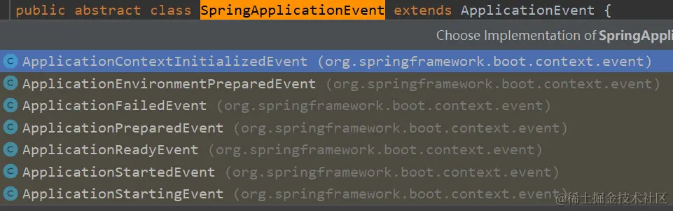 ApplicationStartingEvent 类的父类是 抽象类 SpringApplicationEvent, 而 SpringApplicationEvent 的父类是 ApplicationEvent.