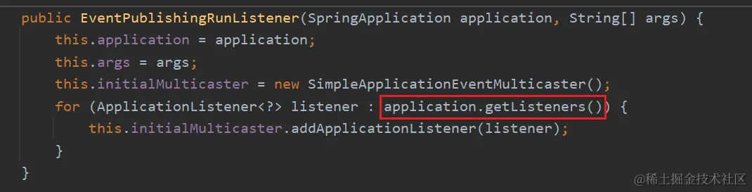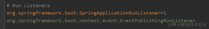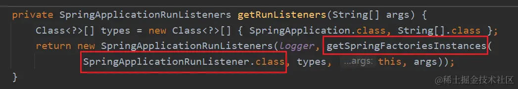 在 getRunListeners 方法里, 又看到了熟悉的 getSpringFactoriesInstances 方法, 这次它用来获取并实例化key = SpringApplicationRunListener的对象.