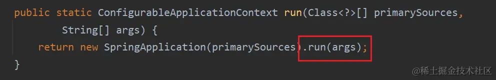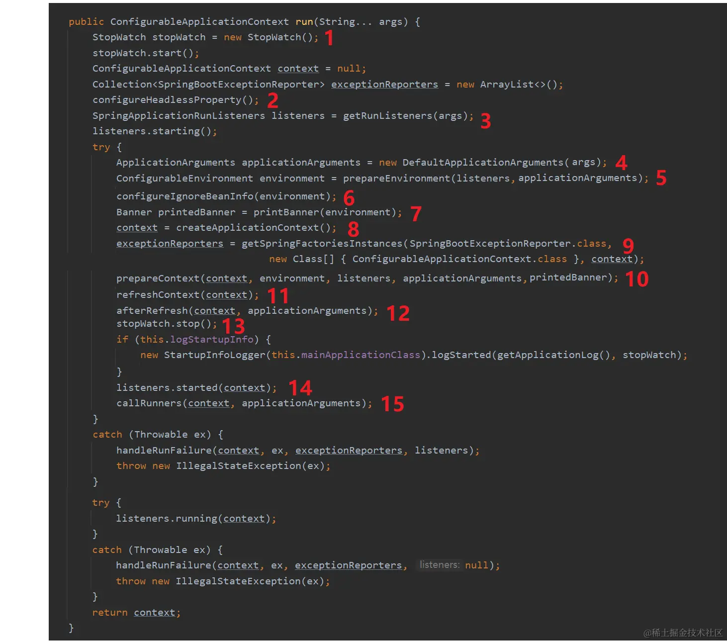 进入 run 方法,run 方法内部就是 SpringBoot 项目启动的主要逻辑了,源码如下: