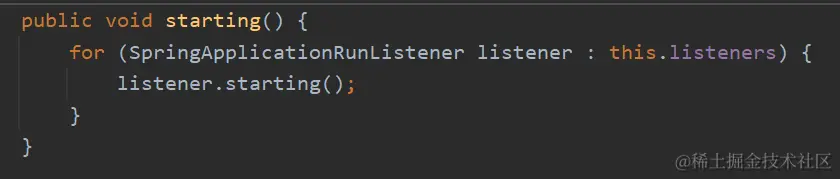 循环调用SpringApplicationRunListener接口实现的 starting() 方法, EventPublishingRunListener 是其唯一实现类, 所以这里就是调用 EventPublishingRunListener 的 starting() 方法.