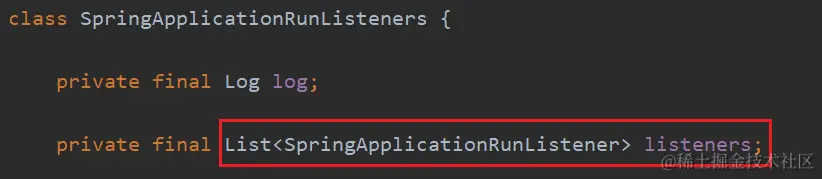 getRunListeners 方法返回的是 SpringApplicationRunListeners对象, 该对象内部使用 List 存放所有实例化的 SpringApplicationRunListener.