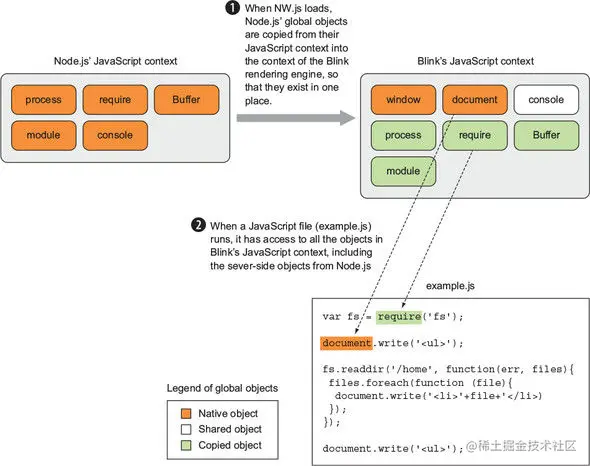 在 NW.js 中,通过将 Node.js 和Chromium 的事件循环集成起来,把 Node.js 的 JavaScript 上下文复制到Chromium的 JavaScript 上下文中,可以让桌面应用中的前后端代码进行状态共享。这种方案带来的一个结果就是使用 NW.js 开发的应用中的视窗可以共享对JavaScript 状态的同一份引用。