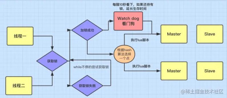Redisson 锁的加锁机制如上图所示,线程去获取锁,获取成功则执行lua脚本,保存数据到redis数据库。