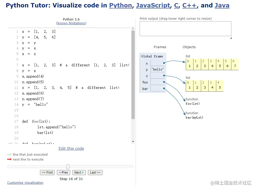 Python Tutor 网站还支持 Java 8、Javascript ES6 和 C/C++(使用 GCC 9.3 编译器)。主要的缺点是,程序在运行时会有所限制(因为在结果返回到你的浏览器之前,程序是在它们的服务器上运行的),但是在大多数的练习例子中,你不会遇到什么问题。