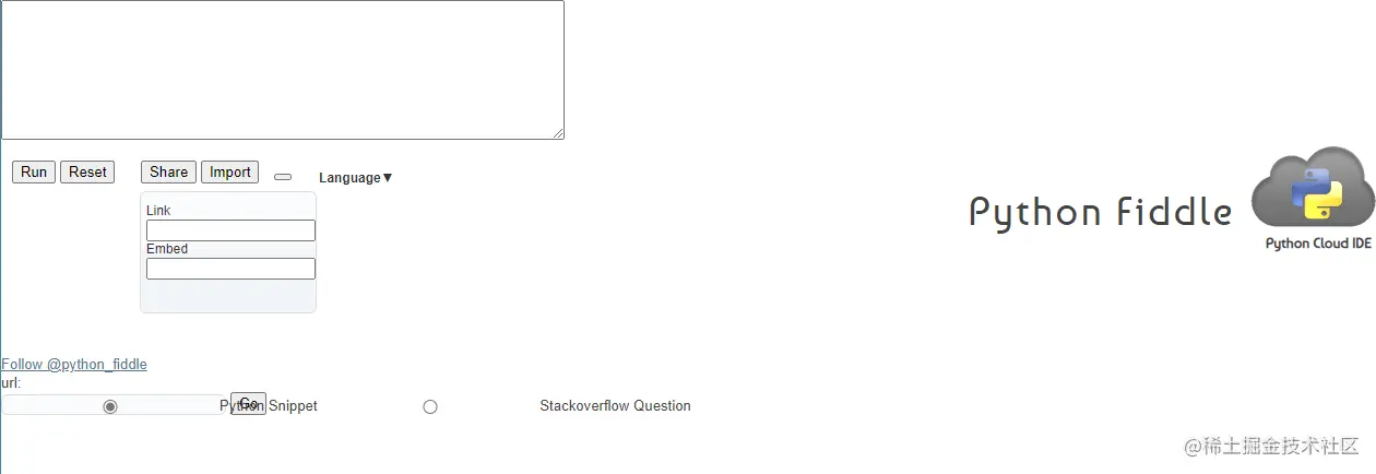 Python Fiddle 是一个简单的编辑器,允许你创建和运行 Python 脚本。它的用户界面太过丑陋了。。。(译注:不忍直视的页面!网站竟然支持两种语言,English与中文,我不经怀疑开发者的身份是……)