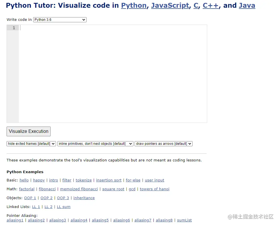 我最喜欢的基于浏览器的 Python 文件编辑器就是 Python Tutor(Python 导师)。Python Tutor 内置了一个调试器,允许每次执行一行,并查看程序的单步执行情况。不仅如此,它还记录了程序在每一步的状态,因此你也可以后退。这是大多数调试器没有的特性。