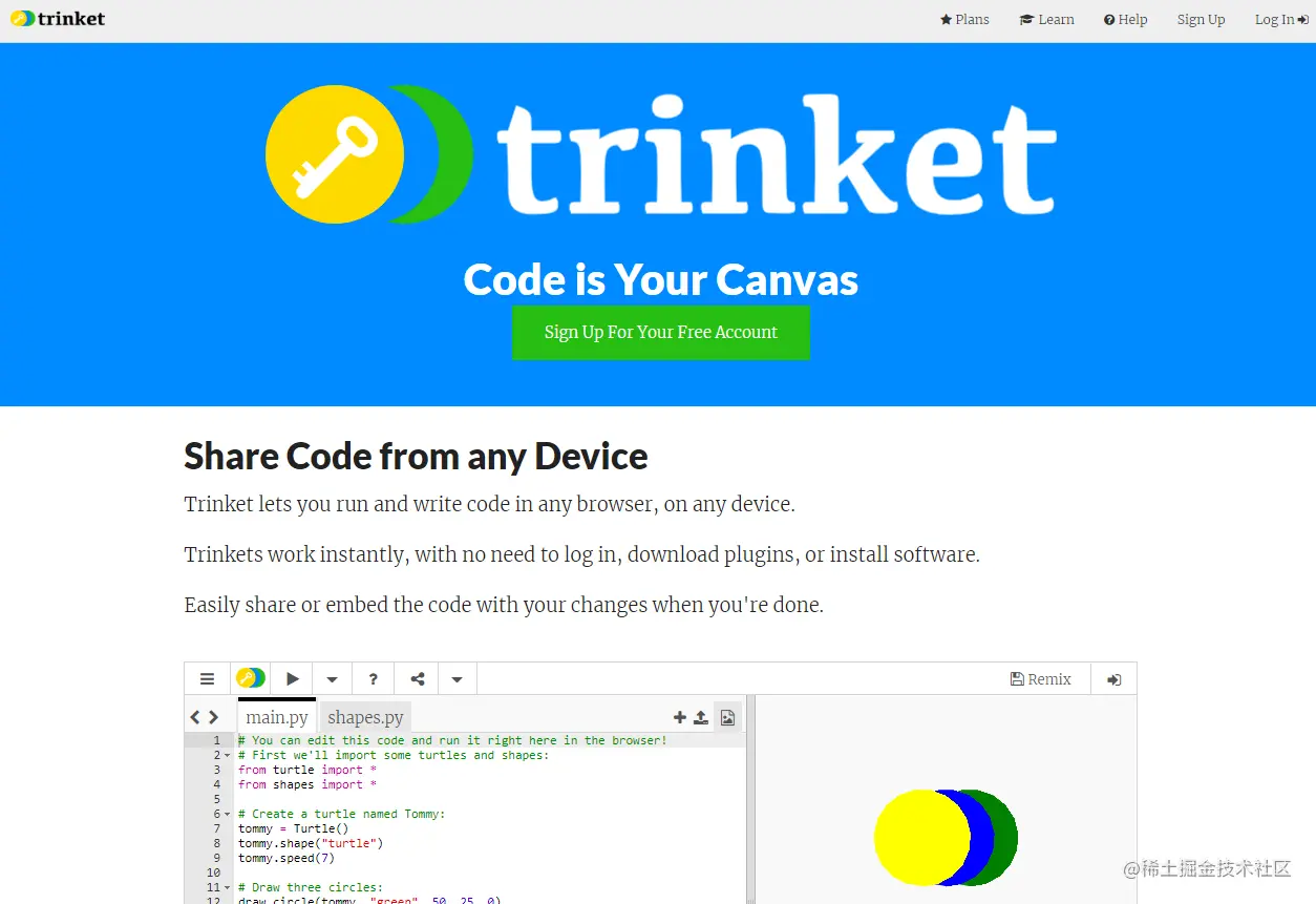 Trinket 是一个以教育为主的网站。你需要注册一个免费的帐户才能使用它,他们的交互式 Shell 还支持Turtle、Matplotlib 和其他模块,而许多在线 REPL 都不支持这些模块。