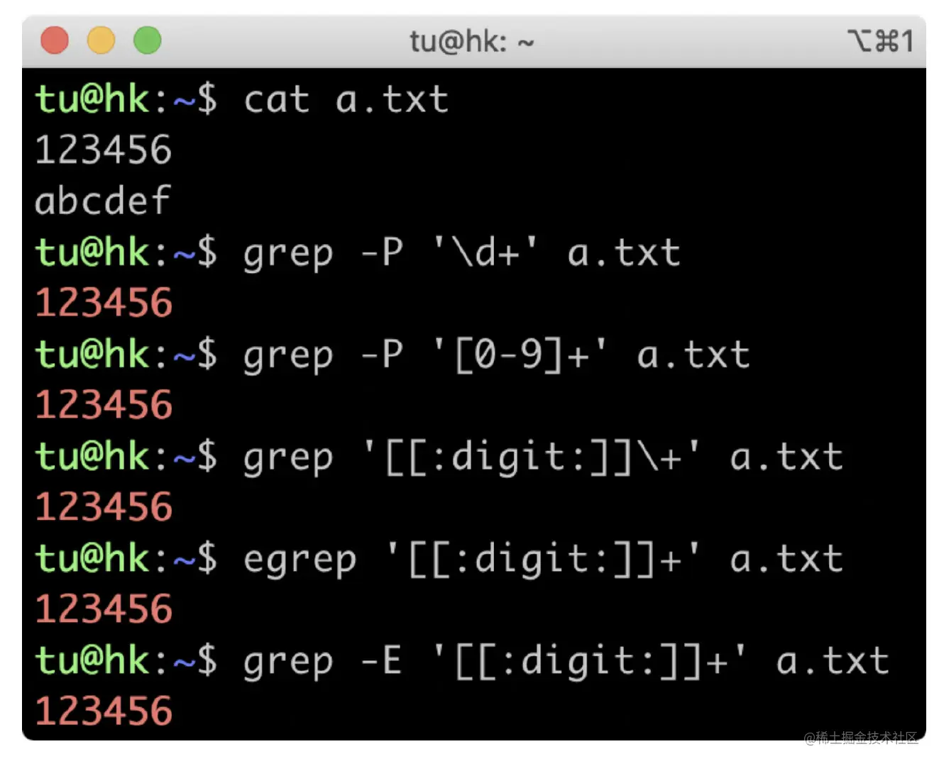 解决方案也很简单,在 grep 命令中,你可以指定参数 -P 来使用 PCRE 流派,这样就和我们之前学习到的是一致的了。知道了原因之后,你应该能写出相应的解决方法。下图是一些能工作的方法。