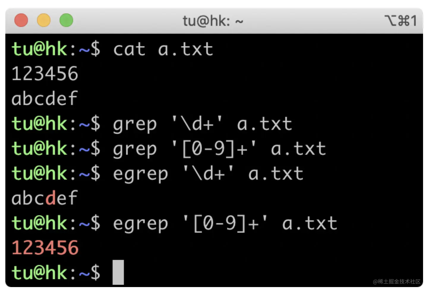 如果你在 Linux 系统的一些命令行中使用正则,比如使用 grep 过滤内容的时候,你可能会发现结果非常诡异,就像下图这样,在 grep 命令中,使用正则\d+ 取不到数据,甚至在 egrep 中输出了英文字母 d 那一行。