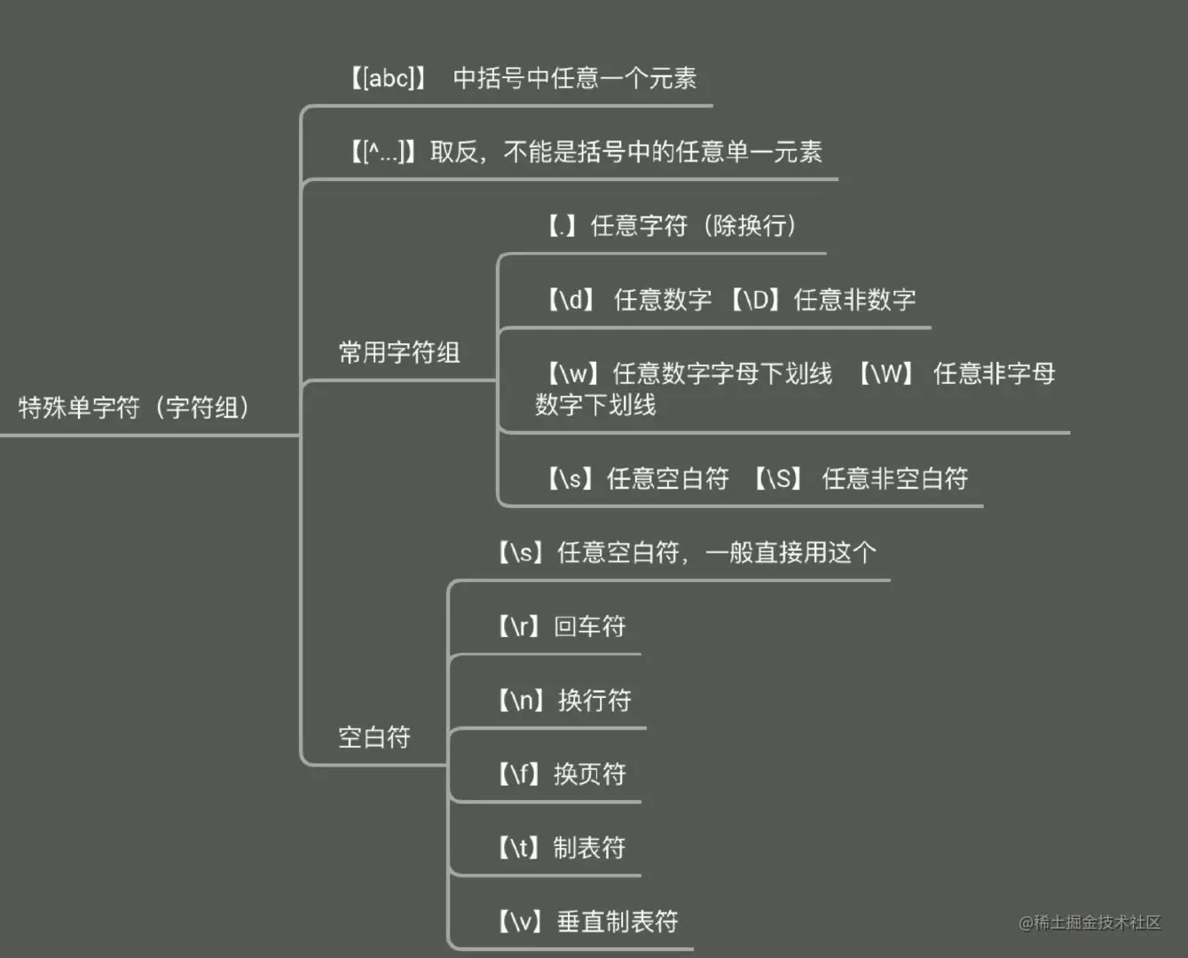 那我们先来了解元字符,有四个维度,分别是【字符组】、【取反字符组】、【常用字符组】、【空白字符】,可以记忆为 【3 + 1】