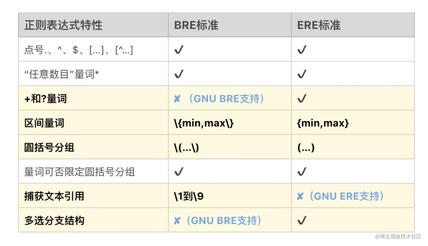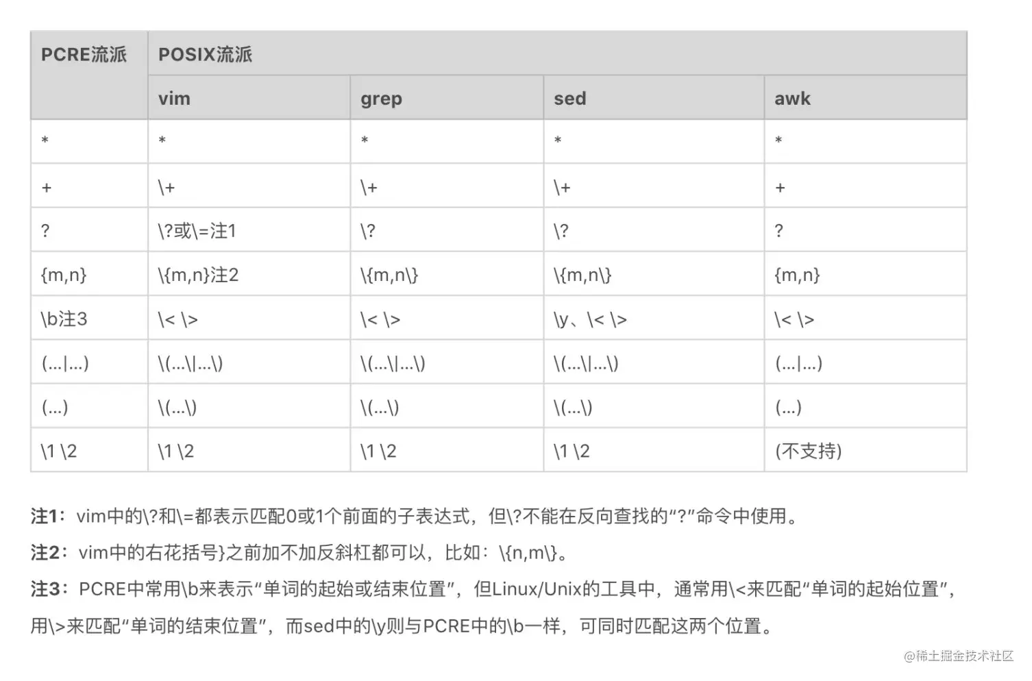 PCRE 流派我们很熟悉,因为每天用到的语言中正则就是遵循这个标准,但 linux 则不同,我们需要留意下差异,避免一脸懵。
