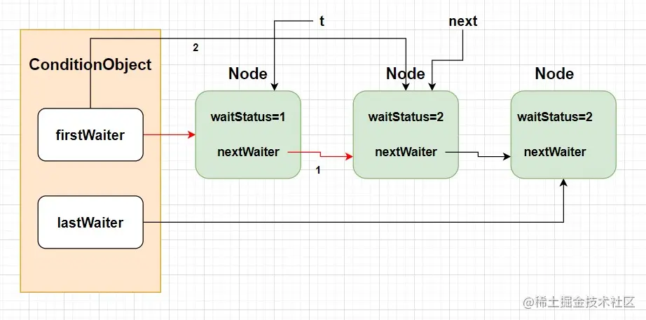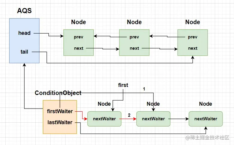 ConditionObject内部维护了一个基于Node的FIFO单向队列,我们把它称为等待队列。firstWaiter指向首节点,lastWaiter指向尾节点,Node中的nextWaiter指向队列中的下一个元素,并且等待队列中节点的waitStatus都是-2。