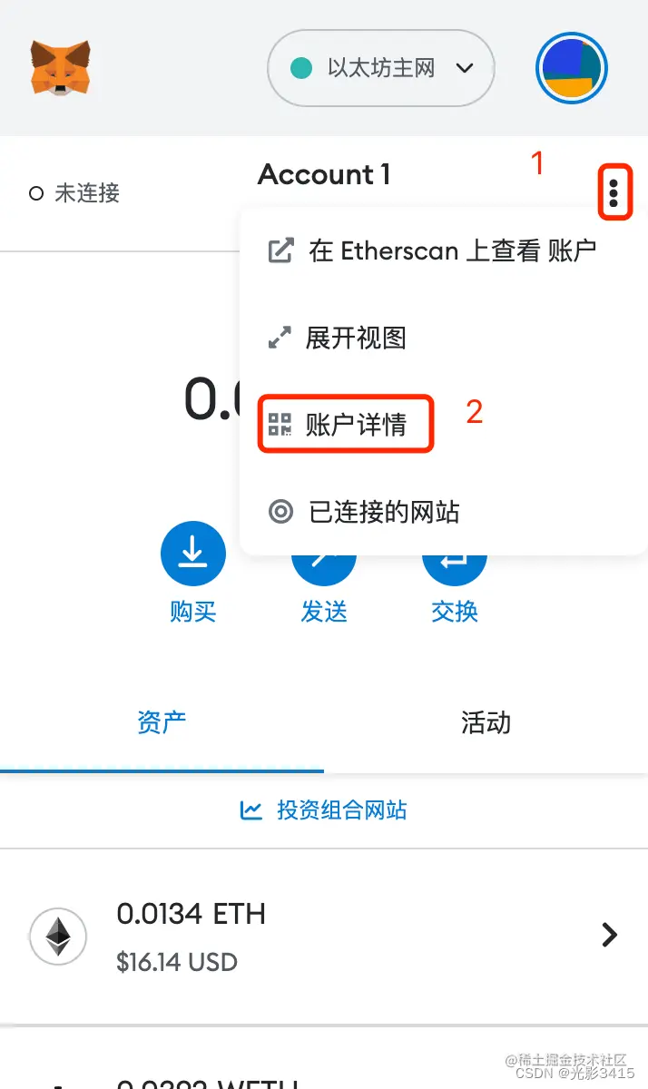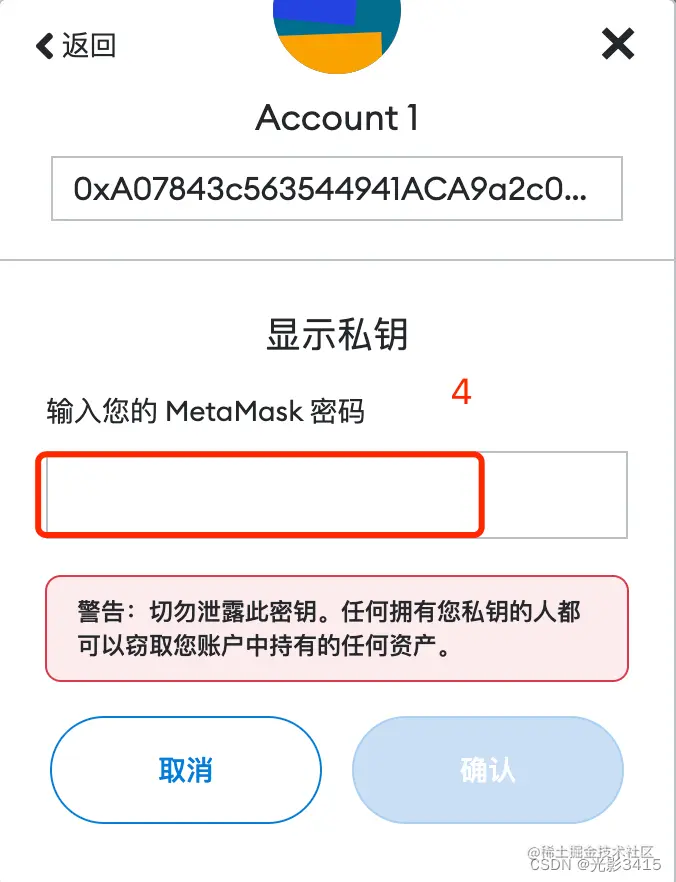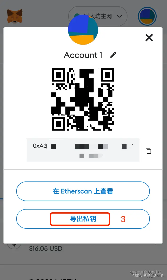 小狐狸 查看钱包 私钥 用户2228160586385 2022-11-24 2,509 阅读1分钟 点击浏览器上的小狐狸 操作如下 第一步和第二步 编辑 第三步: 编辑 第四步:输入密码,就可以看到私钥 编辑 结果: 编辑 注意⚠️: 千万千万不要把私钥给他人。通过私钥可以偷取你账户的资产。 开发时 新建一个钱包地址。