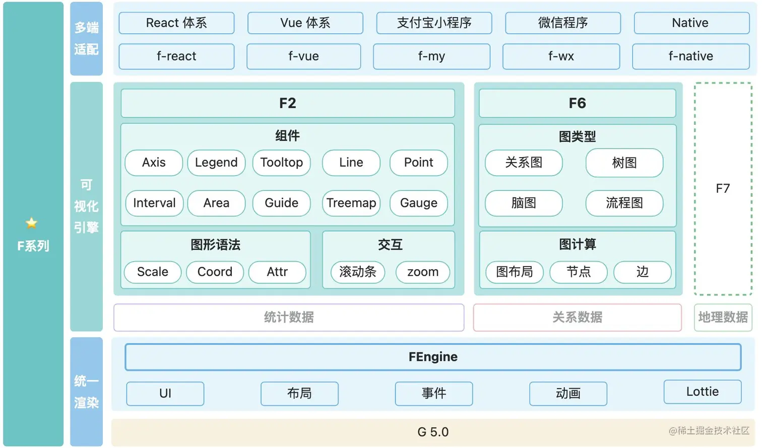 去年 1122 我们基于移动端的特点和共性正式提出了 F 系列可视化产品,立足于移动端,统筹设计移动端可视化解决方案。经过我们在蚂蚁一年的落地和实践,今年我们正式统一了 F 系列的底层架构 (FEngine) ,实现了 F 系列底层架构的的互通,而且我们在底层渲染引擎对接至最新的 G 5.0 上,实现了和 AntV 系列产品的统一与互通,同时 F2 也正式进入 5.0 时代。