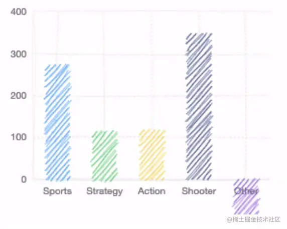 得益于 G 的灵活插件设计,我们可以在 F2 5.0 中引入许多有趣的插件,使用方式也非常方便。如引入 @antv/g-plugin-rough-canvas-renderer ,注册在 render 上面,图表即可一键切换为手绘风格,让你的图表可以萌萌哒🙊,具有视觉吸引性。