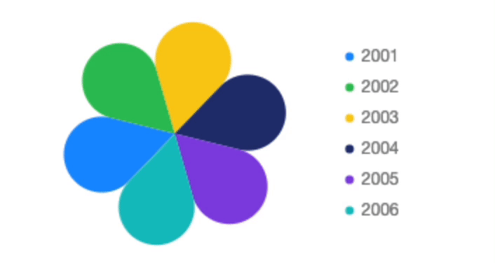 相比于 4.x 中同类型图表间的形变,新版本可以支持任意不同图表间的形变。无论是折线图、柱状图、扇形图还是气泡图、饼图、玫瑰图,都可以做图形形变动画。使用 Timeline 组件,可以轻松自动播放组件内的图表。