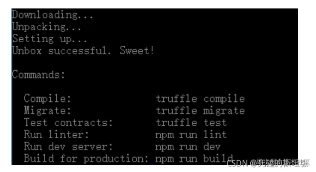 truffle unbox: 直接下载一个truffle box,即一个预先构建好的truffle项目;unbox的过程相对会长一点,完成之后应该看到这样的提示: