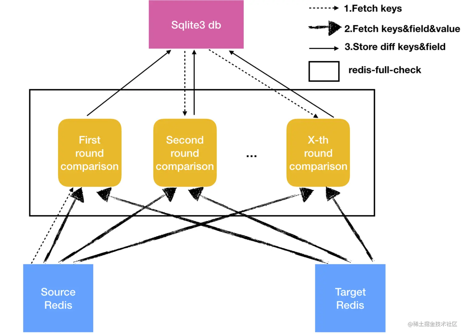 redis-full-check通过全量对比源端和目的端的redis中的数据的方式来进行数据校验,其比较方式通过多轮次比较:每次都会抓取源和目的端的数据进行差异化比较,记录不一致的数据进入下轮对比(记录在sqlite3 db中)。