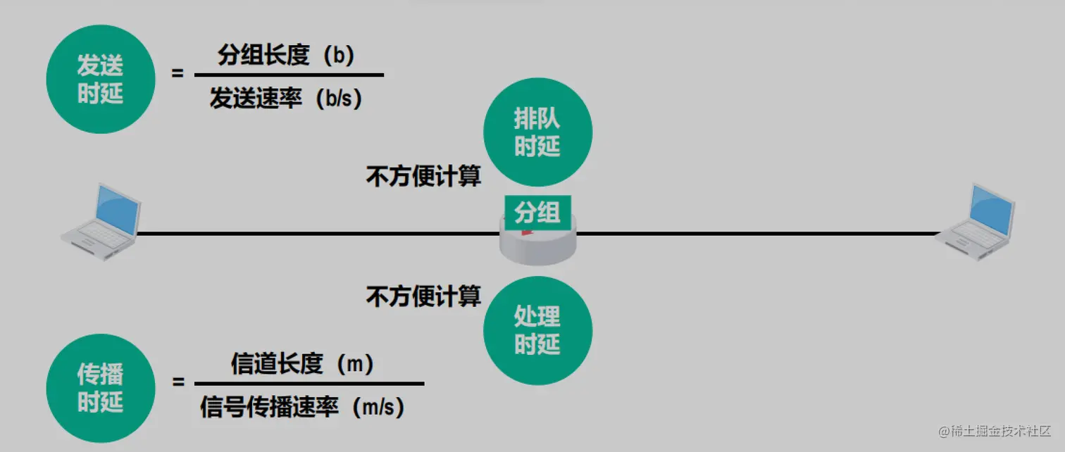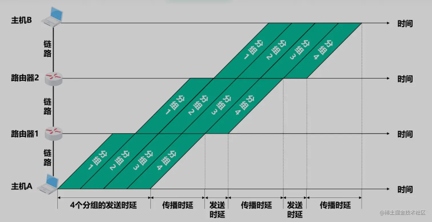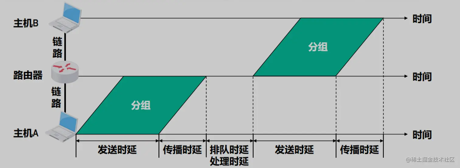 也就是说把分组发送出去以及在传播过程都需要时间,而在路由器需要进行排队和处理也需要时间,路由器还需要发送和传播的时间,我们可以通过下面这个图更清晰的看出: