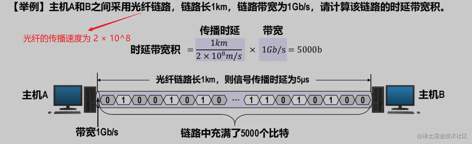 时延带宽积可以理解为:以比特为单位的链路长度,我们可以知道链路中有多少个比特,时延带宽积 = 时延 × 带宽,我们可以用下面这个例子来帮助我们理解