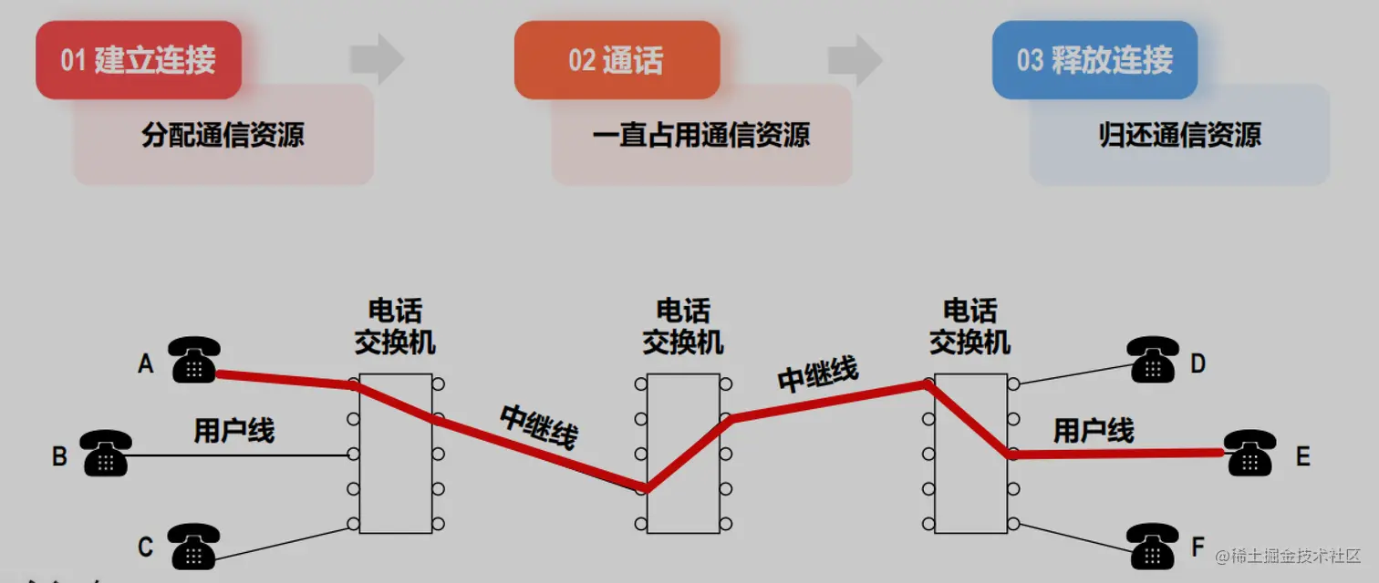 我们纵轴为时间轴,横轴为数据的传播,可以画出三种交换的交换过程: