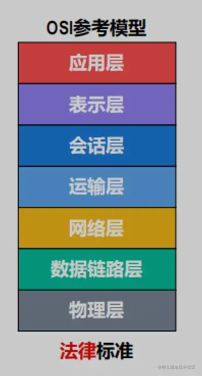 OSI参考模型是法律标准,把计算机网络分为了七层:应用层、表示层、会话层、运输层、网络层、数据链路层、物理层