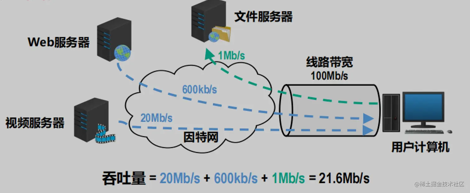 此处的吞吐量 = 20Mb/s + 600kb/s + 1Mb/s = 21.6Mb/s