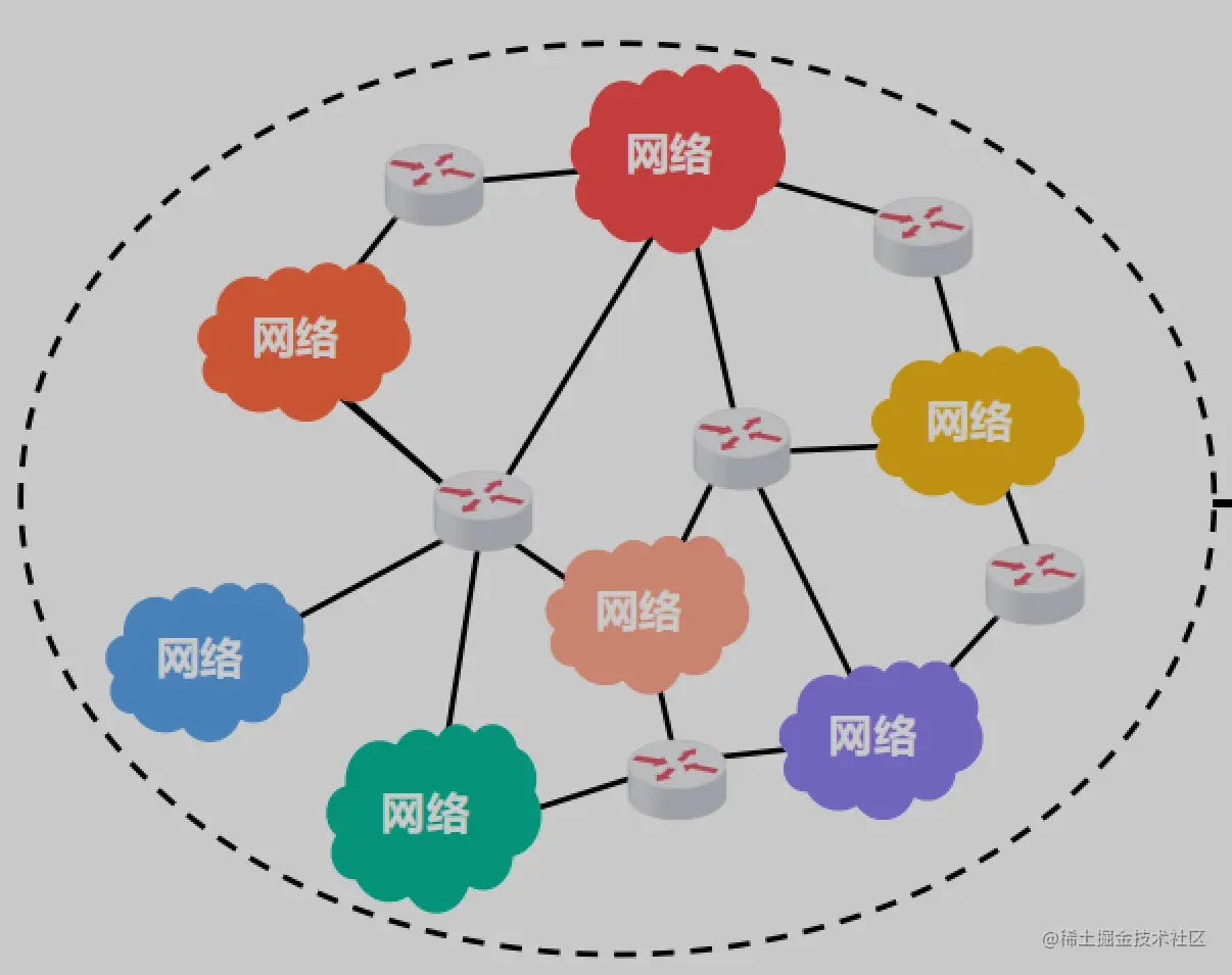 而网络与网络之间进行互联也就是我们所说的互联网,而互联所需要的设备就是路由器,通过路由器我们可以连接多个网络,即若干网络通过路由器互联形成互联网: