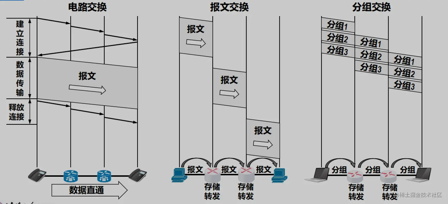 网络之间进行通信的方式有着以下三种方式,尽管随着时间的推移,现在我们基本上使用分组交换,但是发展的历程还是值得我们去探究的: