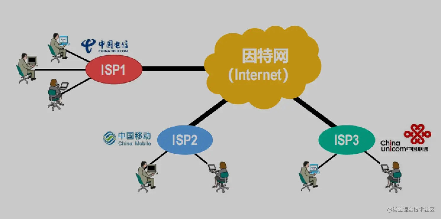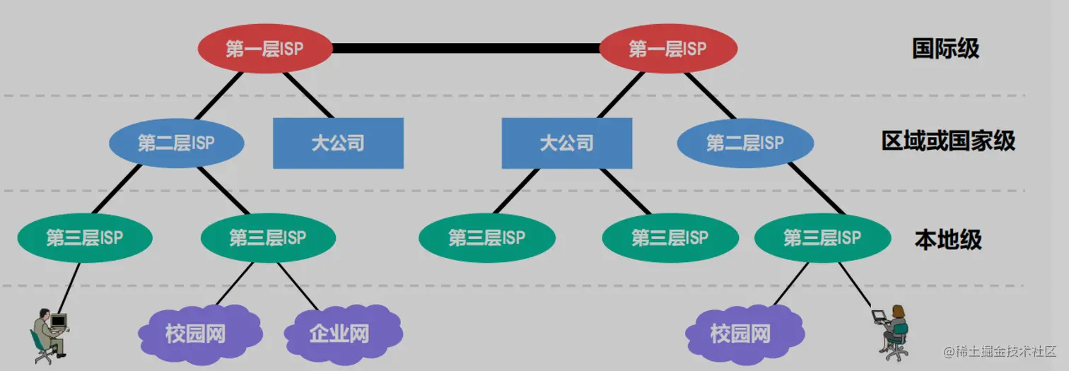 因特网已经发展成为基于ISP的多层次结构的互联网络,就这样层层代理下来: