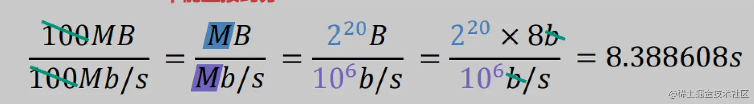 思考:有一个待发送的数据块,大小为100MB,网卡的发送速率为100Mbps,则网卡发送完该数据块需要多长时间?