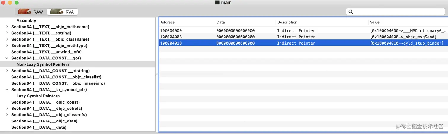 进而看到 dyld_stub_binder 位于非 lazy 绑定符号指针表中