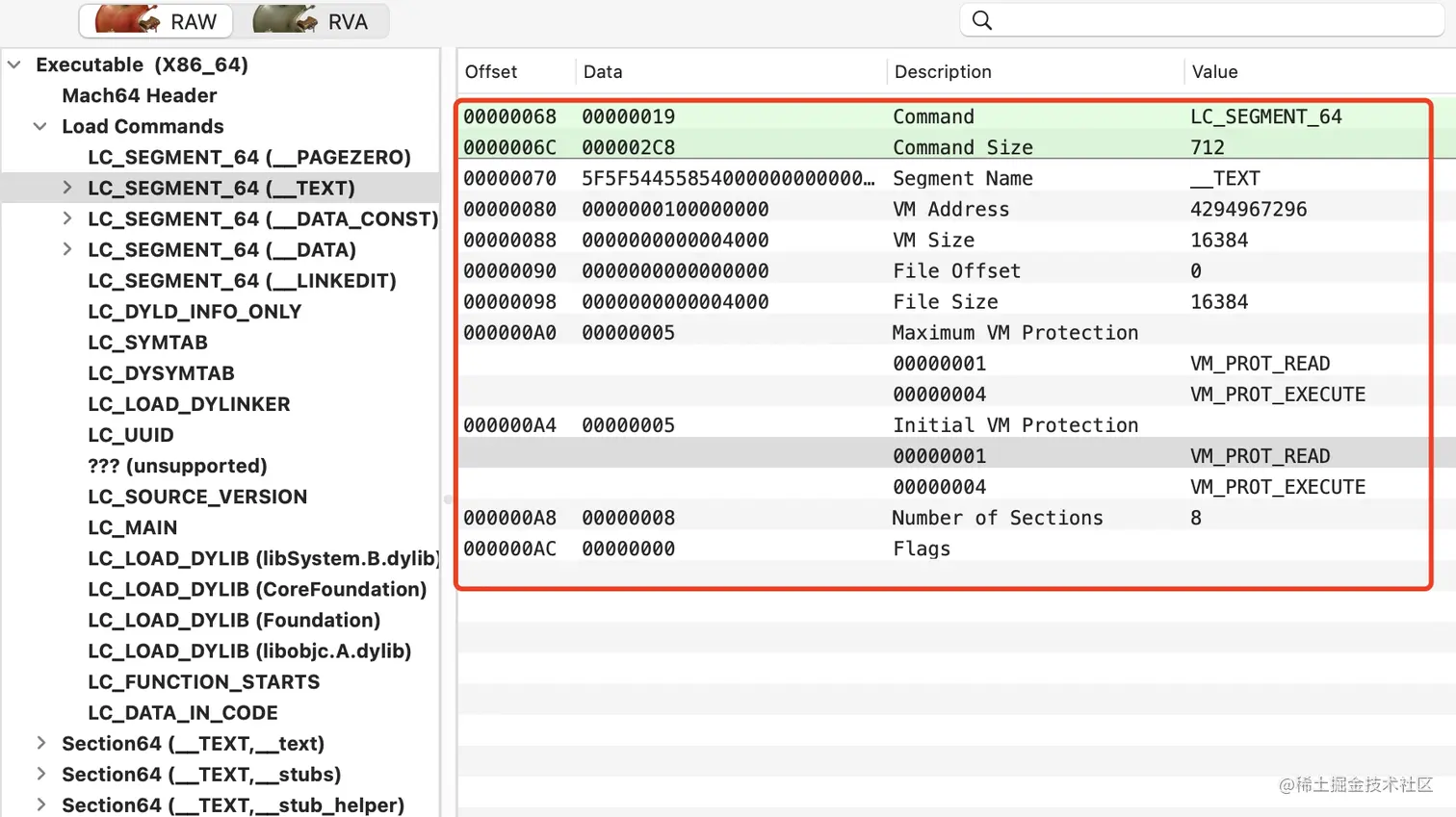 - Load Commands(加载命令),正如官方的图所示,描述了怎样加载每个 Segment 的信息。在 Mach-O 文件中可以有多个 Segment,每个 Segment 可能包含一个或多个 Section。