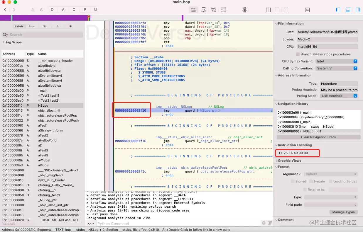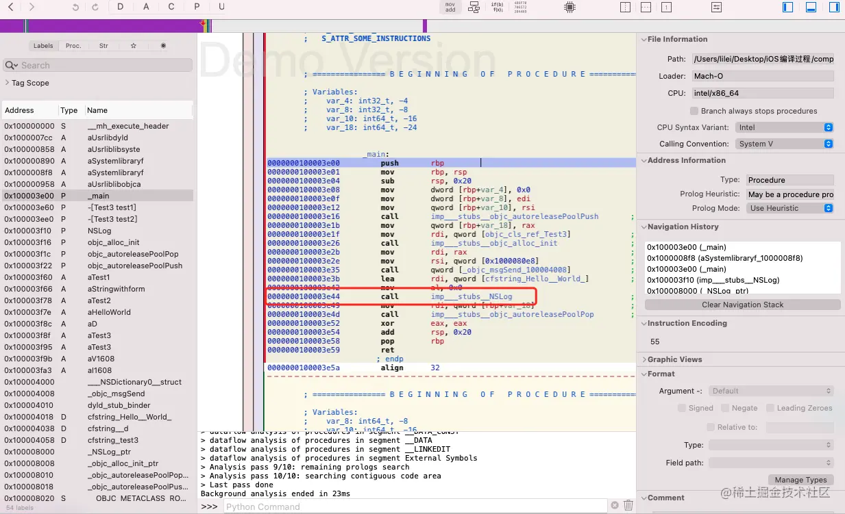 反汇编后可以看到调用 NSLog 时是用了 call imp__stubs__NSLog 指令