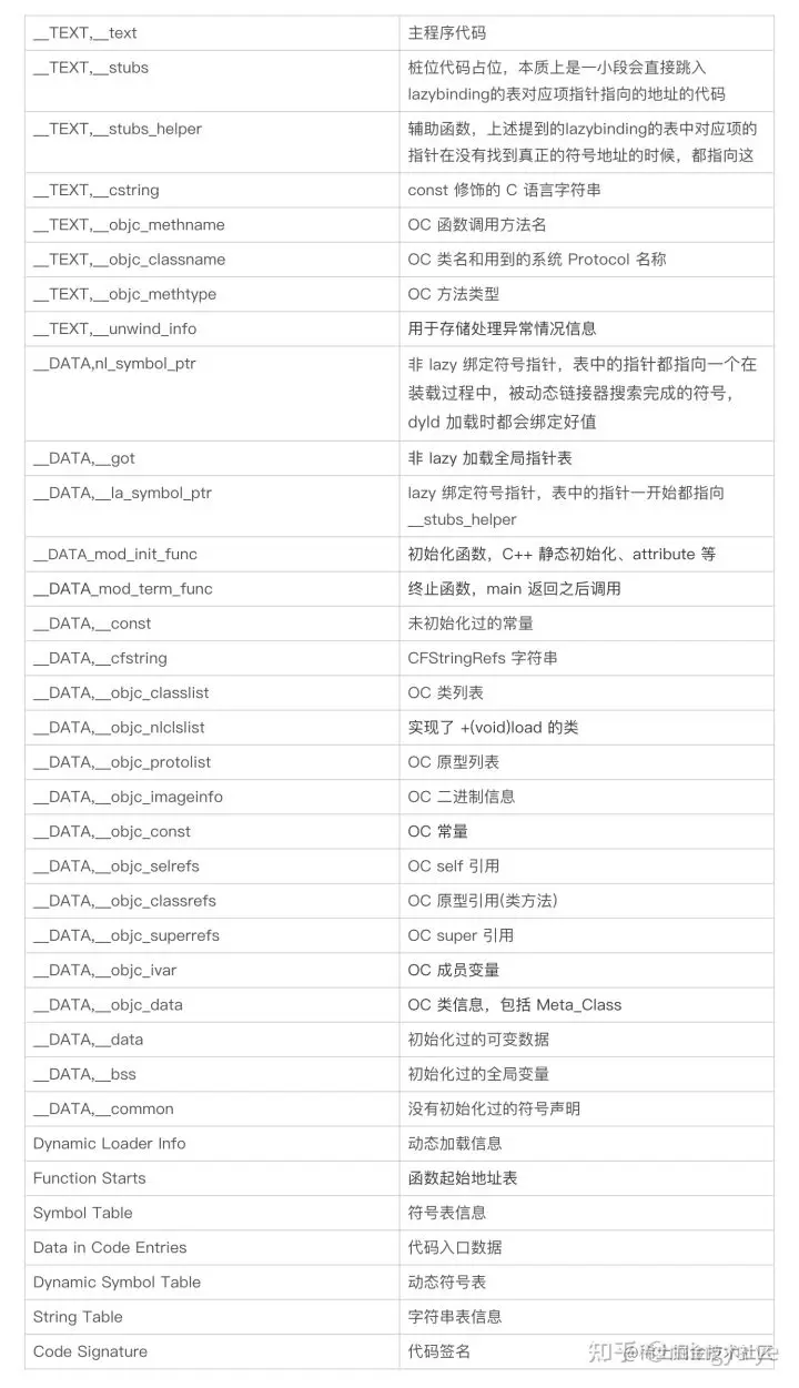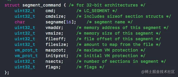 #define SEG_PAGEZERO "__PAGEZERO" // 可执行文件捕获空指针的段#define SEG_TEXT "__TEXT" // 代码段,只读数据段#define SEG_DATA "__DATA" // 数据段#define SEG_LINKEDIT "__LINKEDIT" // 包含动态链接器所需的符号、字符串表等数据