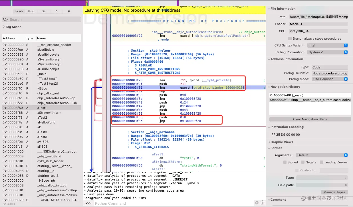 首先二进制调用 NSLog、objc_release 等外部符号时,指令并没有与 NSLog 的实现地址进行绑定,而是利用 stub 放了桩指令,指令指向 la_symbol_ptr 表中,而 la_symbol_ptr 表中的指针在未绑定符号地址时,都指向 stub_helper,而 __stub_helper 作为辅助函数都指向 __DATA,__got/nl_symbol_ptr 中的 dyld_stub_binder,