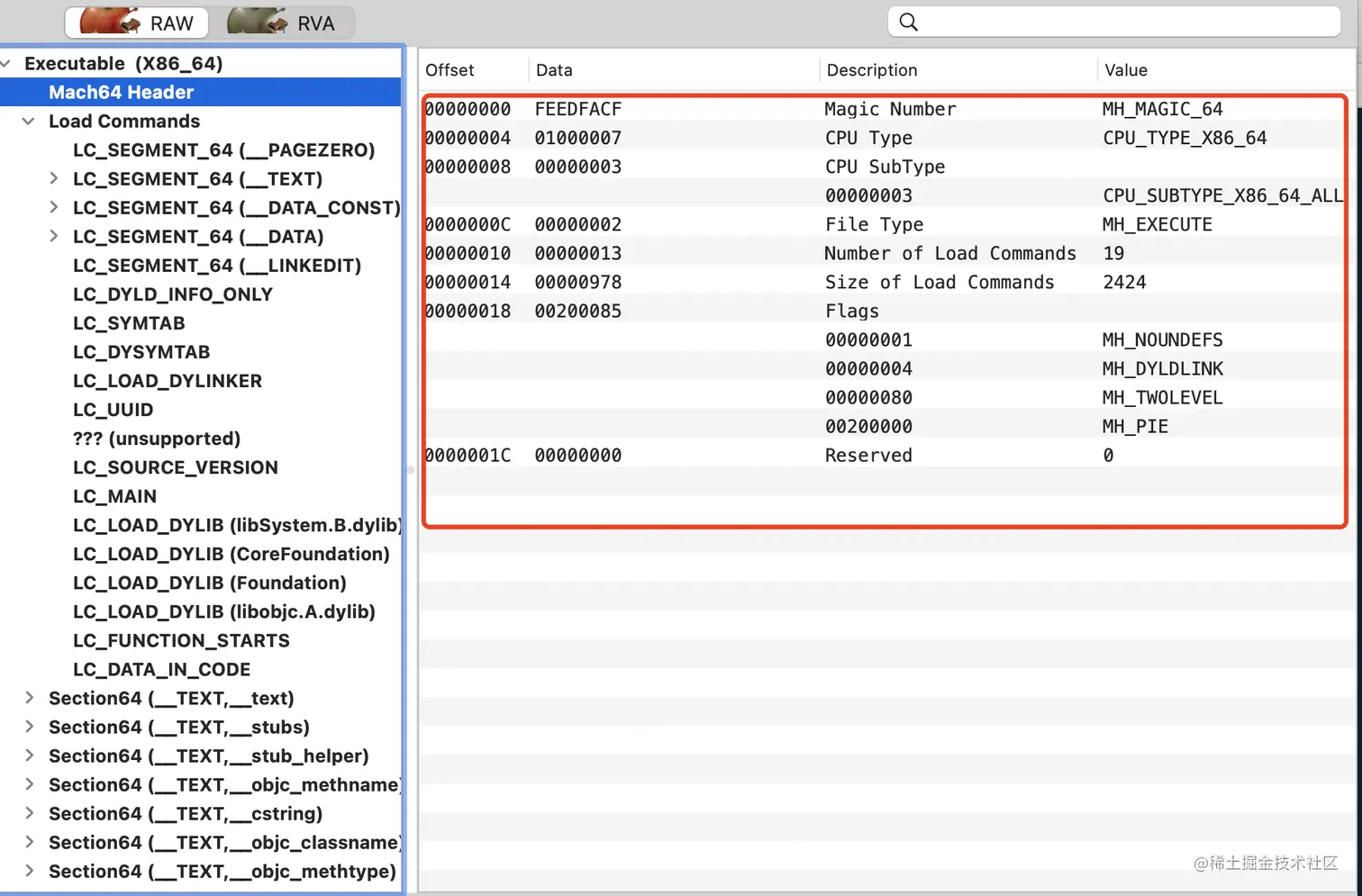 - Header(头部),指明了 cpu 架构、大小端序、文件类型、Load Commands 个数等一些基本信息