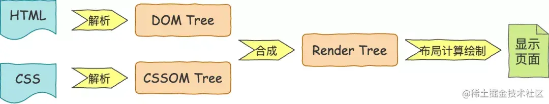 为什么是这个结论呢?试想一下页面渲染的流程就知道了。浏览器首先解析 HTML 生成 DOM 树,解析 CSS 生成 CSSOM 树,然后 DOM 树和 CSSOM 树进行合成生成渲染树,通过渲染树进行布局并且计算每个节点信息,绘制页面。