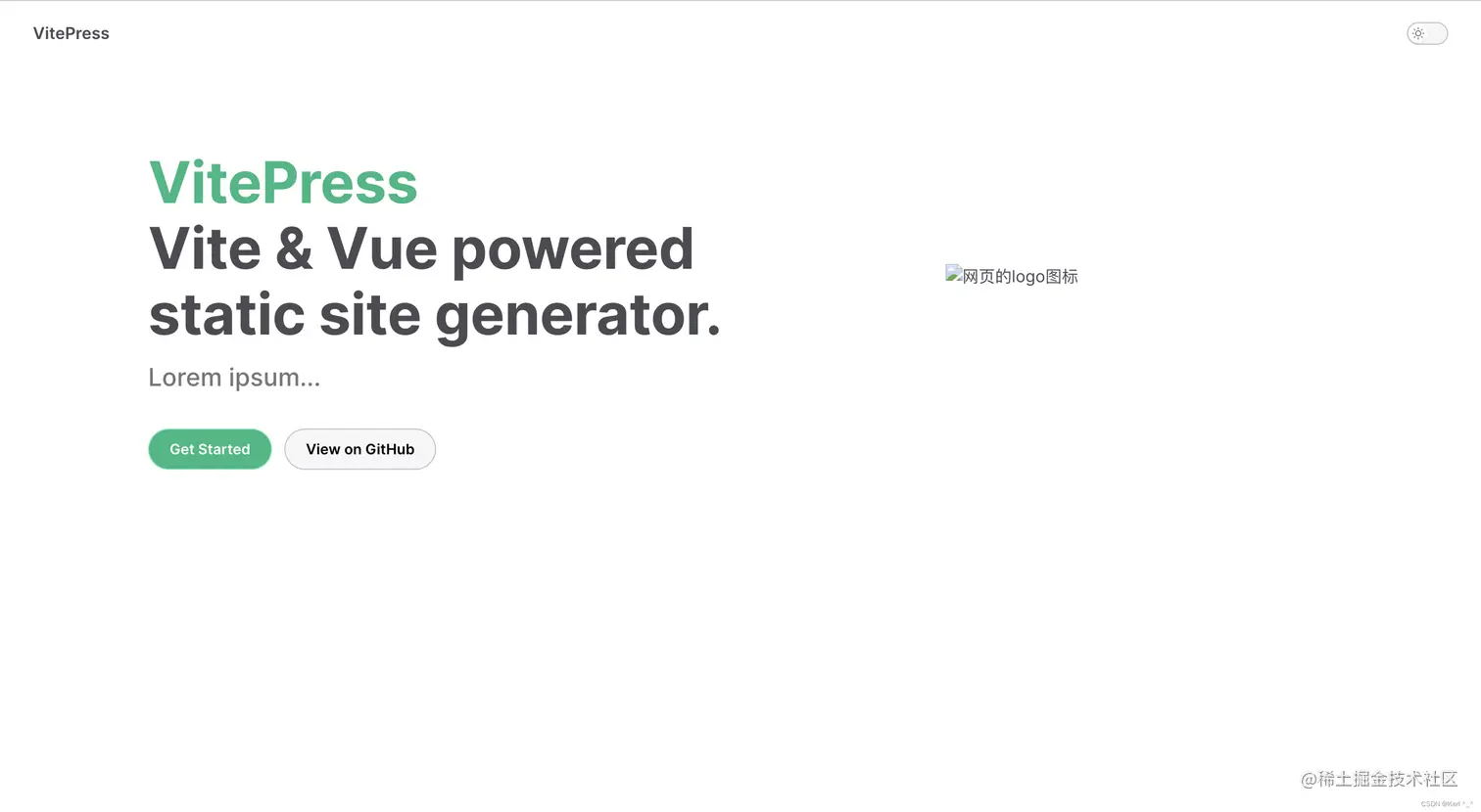 那么我们加入图片,大家肯定会问在哪加呢?我们启动项目的命令是 vitepress dev docs,那么我们的图片都根目录就是 docs 所以上面配置中是 /logo.png,我们只需要在 docs 中加入名为 logo.png 的图片后就会显示,效果如下: