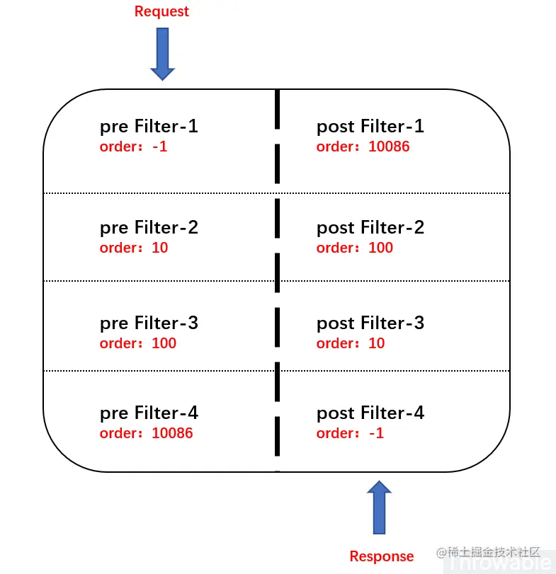 - POST:这种过滤器在路由到微服务以后执行。这种过滤器可用来为响应添加标准的HTTP Header、收集统计信息和指标、将响应从微服务发送给客户端等。