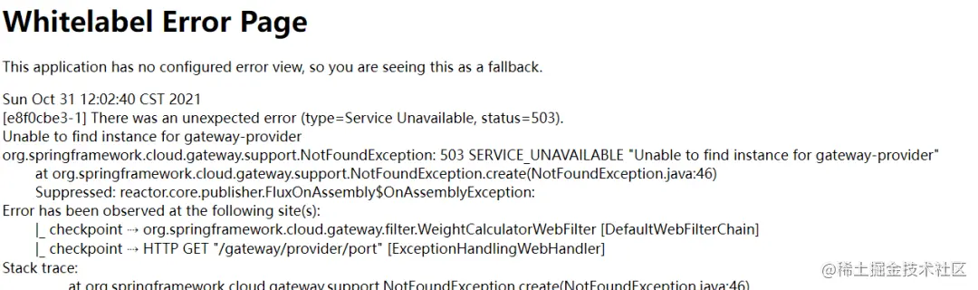 通过前面的测试可以看到一个现象:一旦路由的微服务下线或者失联了,Spring Cloud Gateway直接返回了一个错误页面,如下图: