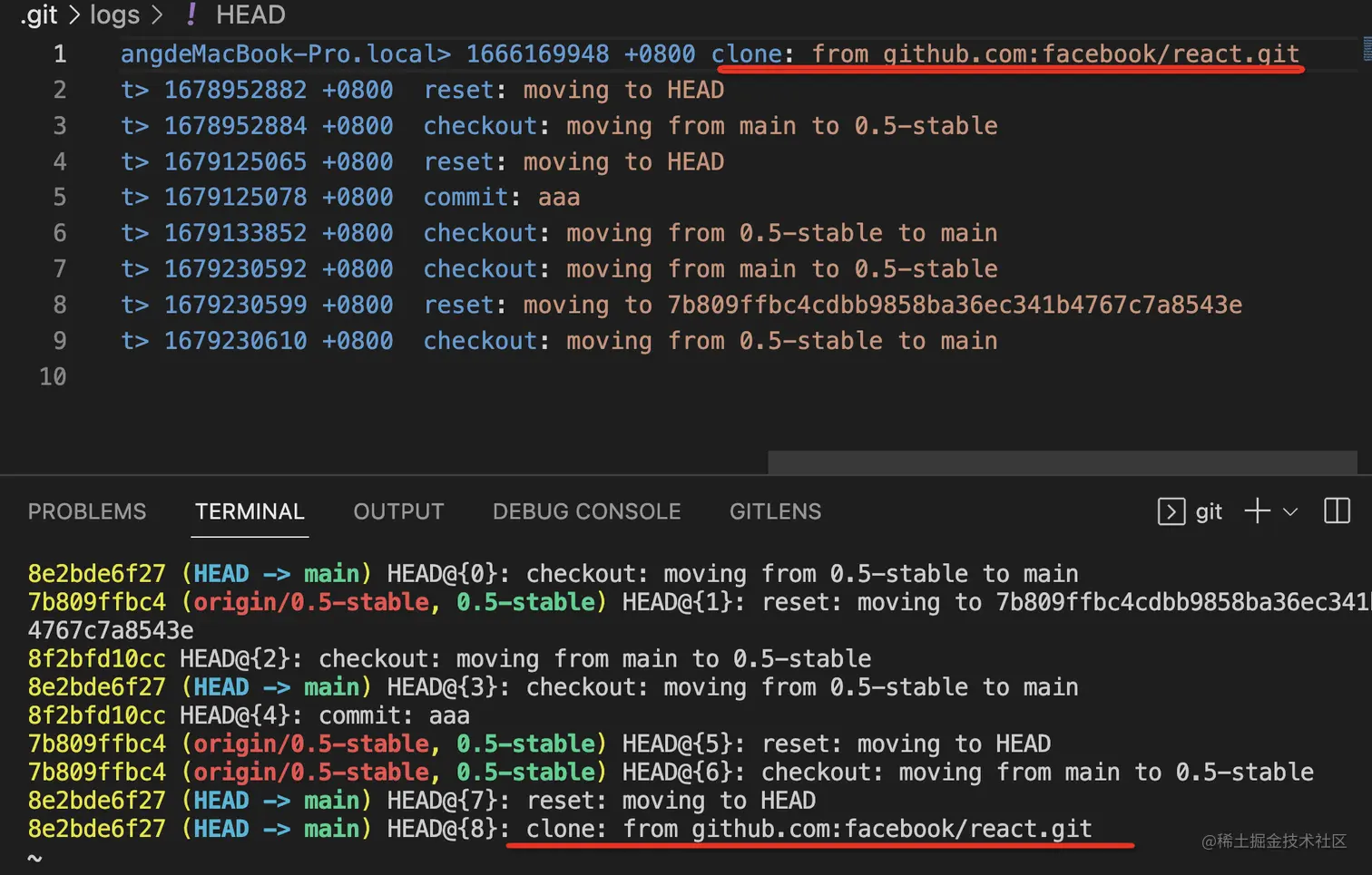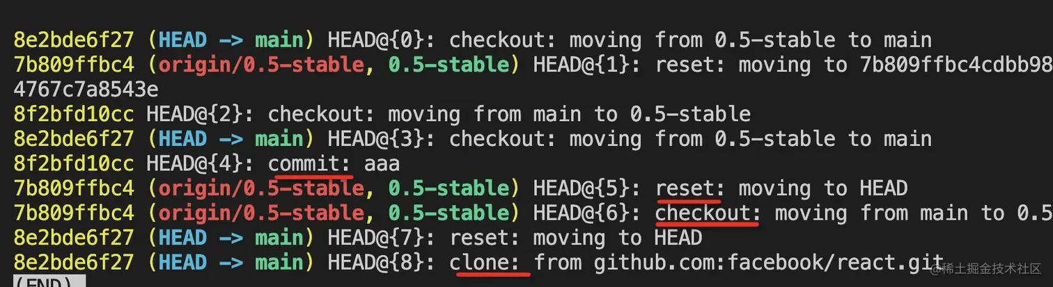 比如 HEAD 的 reflog,对比下是不是一毛一样(顺序是反的):